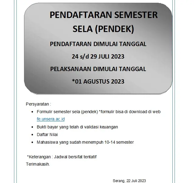 FORMULIR DI DOWNLOAD DI: https://fe.unsera.ac.id/2023/07/22/formulir-dan-surat-pernyatan-semester-sela-pendek/ BERKAS PENDAFTARAN DI KUMPULKAN DI AKDEMIK fe