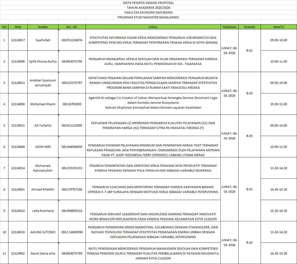 PENGUMUMAN JADWAL SIDANG PROPOSAL PRODI MAGISTER MANAJEMEN (JUMAT, 06 MARET 2026)