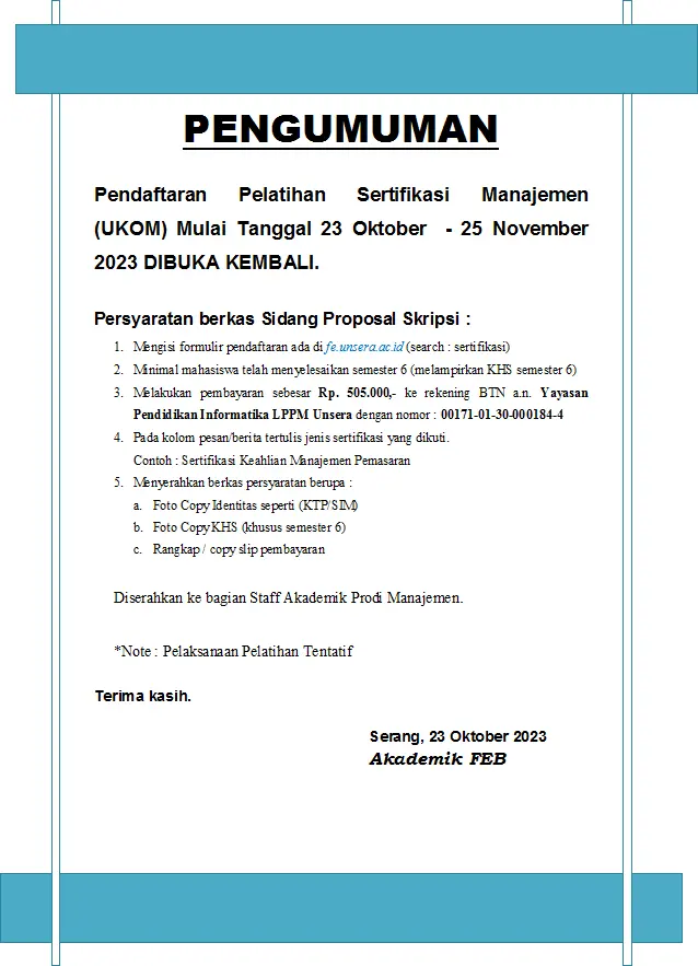 PENGUMUMAN PENDAFTARAN PELATIHAN SERTIFIKASI (UKOM) PRODI MANAJEMEN TA.2023/2024 (OKTOBER 2023)