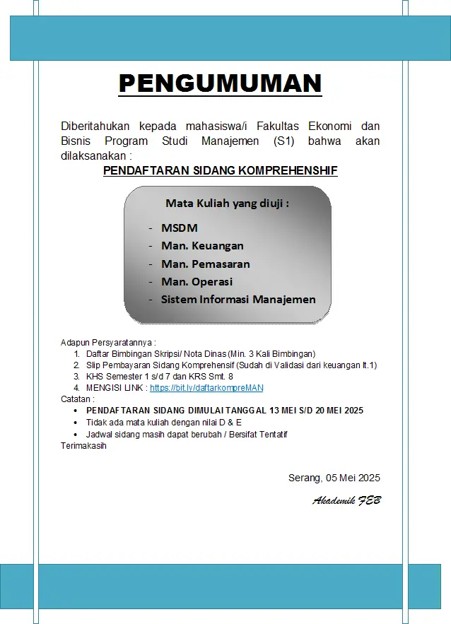 PENGUMUMAN PENDAFTARAN SIDANG KOMPREHENSHIF GEL. 1 PRODI MANAJEMEN T.A 2024-2025 GENAP