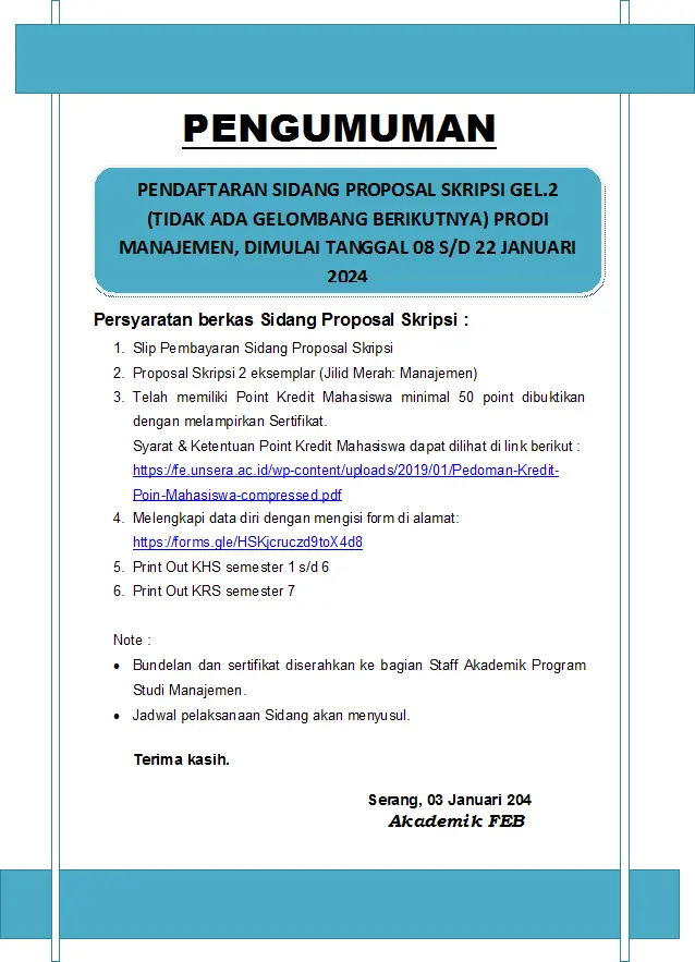 PENGUMUMAN PENDAFTARAN SIDANG PROPOSAL SKRIPSI MANAJEMEN GEL. 2 T.A. 2023/2024 (Tidak ada gelombang berikutnya)