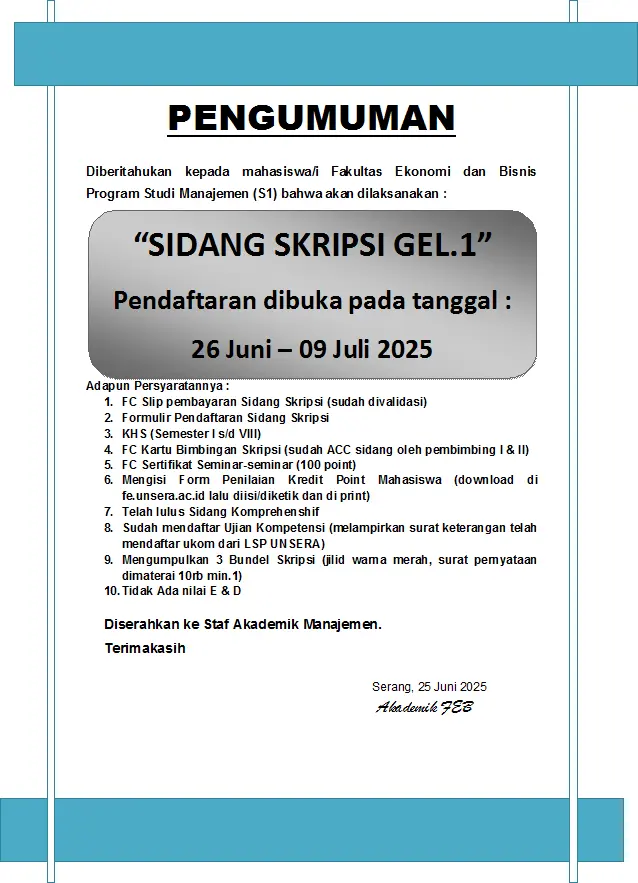 PENGUMUMAN PENDAFTARAN SIDANG SKRIPSI GEL 1 TAHUN AKADEMIK 2024-2025 GENAP PRODI MANAJEMEN