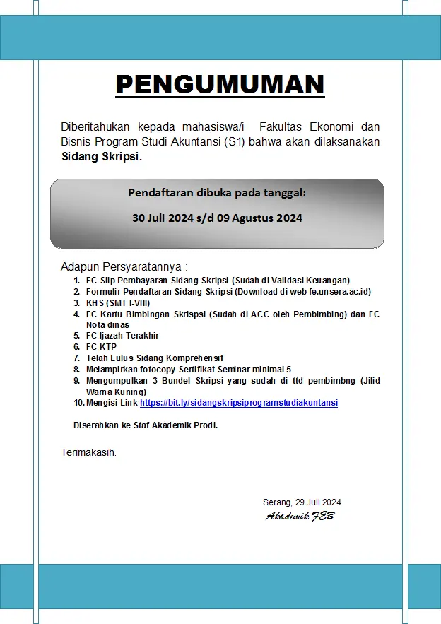 PENGUMUMAN PENDAFTARAN SIDANG SKRIPSI PRODI AKUNTANSI 2023/2024 GENAP
