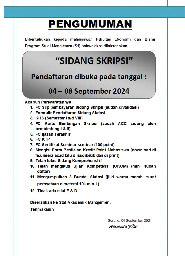 PENGUMUMAN PENDAFTARAN SIDANG SKRIPSI PRODI MANAJEMEN GELOMBANG 3