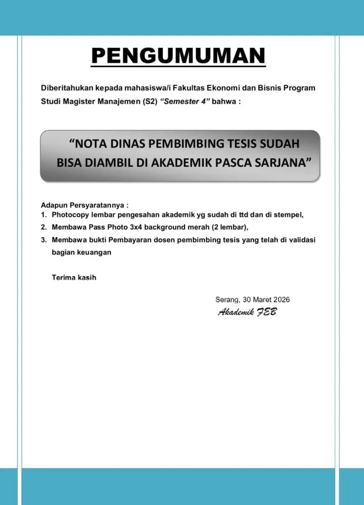 PENGUMUMAN PENGAMBILAN NOTA DINAS PEMBIMBING TESIS PRODI MAGISTER MANAJEMEN (S2) T.A 2025/2026 GENAP